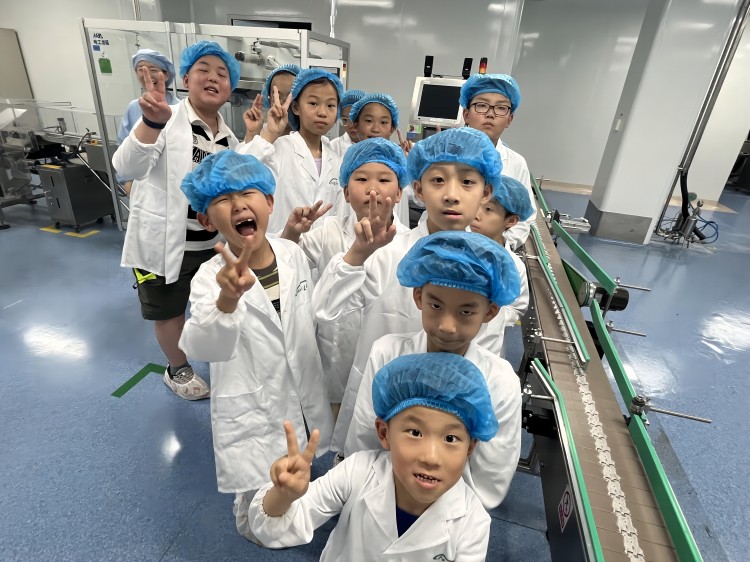 緊接著孩子們來到了小容量注射劑1號車間。在進(jìn)入生產(chǎn)區(qū)的剎那,透過巨大的玻璃展窗,孩子們發(fā)出陣陣驚嘆——儲水罐猶如高大威猛的巨人,佇立在光亮整潔的制水間內(nèi)。注射液的誕生之路便從這里開始。在滅菌間內(nèi),孩子們對巨大的鐵柜子充滿了好奇,它就是飽和蒸汽滅菌柜,是藥支“蒸桑拿”的地方。孩子們在這里學(xué)習(xí)到了溫度與微生物之間的親密關(guān)系。在燈檢間內(nèi),巨大的星輪圓盤與隊(duì)列整齊的藥支們訴說著質(zhì)量第一的故事。最后,在包裝間內(nèi),從分托入托機(jī)到裝箱機(jī),藥支們陸續(xù)穿上漂亮的服裝,成功誕生為完整的產(chǎn)品。孩子們了解到,每一支注射劑的誕生,都是科技與智慧的結(jié)晶,是保護(hù)人類健康的超級英雄。