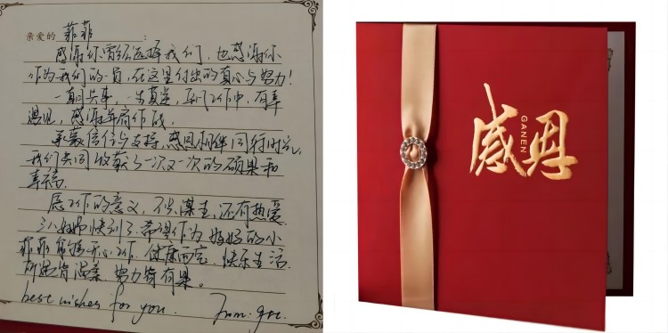 感謝卡:感謝你曾經(jīng)選擇我們,也感謝你作為我們的一員,在這里付出的真心與努力!一朝共事,一生莫逆,平凡工作中,有幸遇見,感謝并肩作戰(zhàn)。承蒙信任與支持,感恩相伴同行時光,我們共同收獲了一次又一次的碩果和幸福。愿工作的意義,不只謀生,還有熱愛。希望作為媽媽的小菲菲能夠開心工作,健康兩寶,快樂生活,所遇皆溫柔,努力皆有果。Best wishes for you.