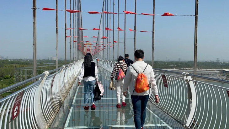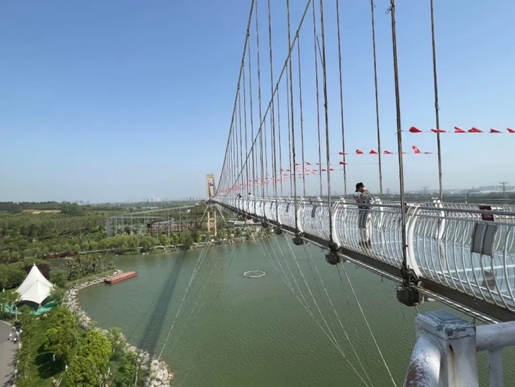 午后升溫的烈日下,完成競(jìng)賽的成員三五成群的來(lái)到游樂(lè)設(shè)施區(qū)域。最火爆的項(xiàng)目非“鵲橋”——高空玻璃棧道莫屬。